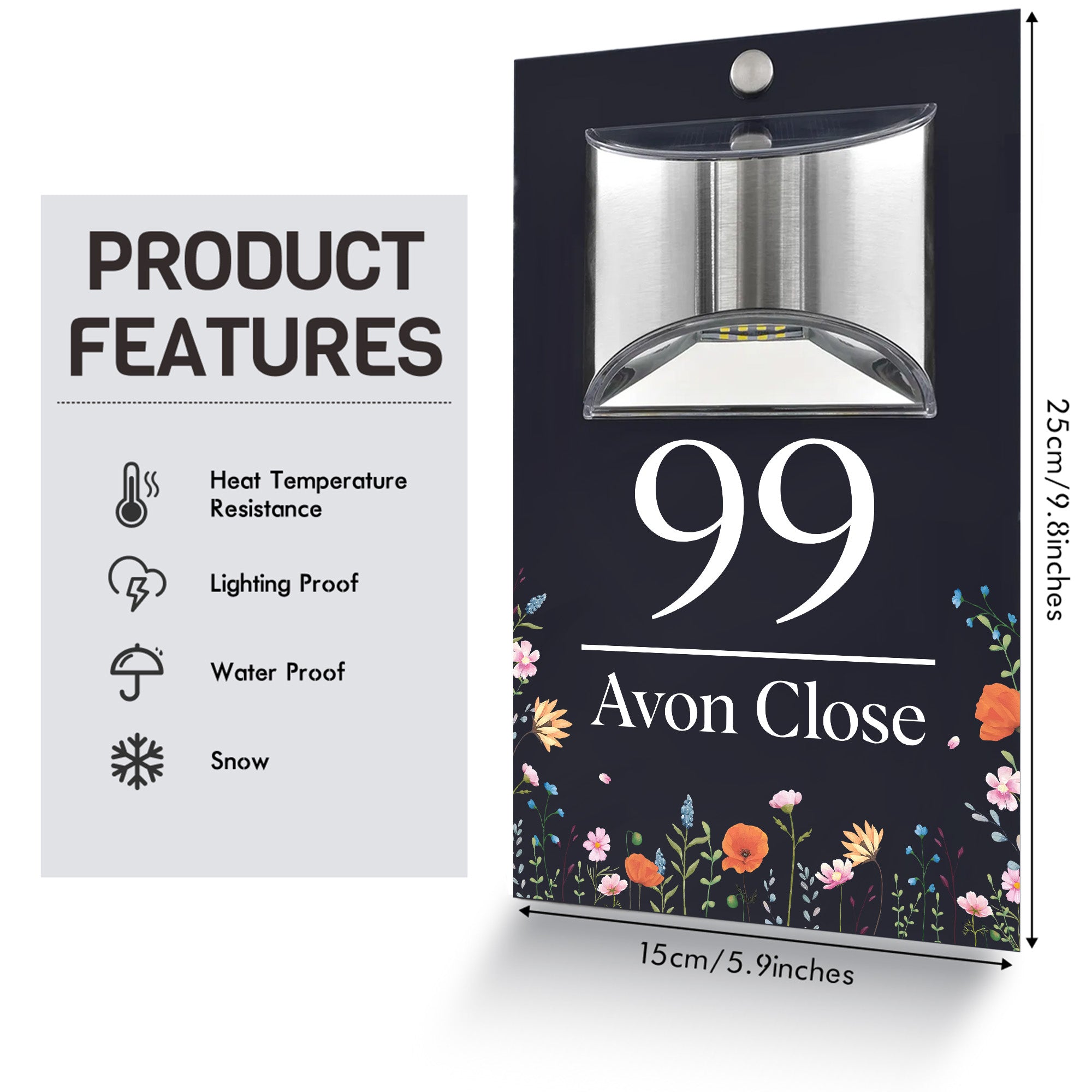 Make your address visible day and night with the Solar Illuminated Wildflowers Field House Number Sign. Crafted from premium acrylic and decorated with a vibrant UV-printed floral design, this plaque combines modern aesthetics with smart functionality. Featuring built-in LED lights and a high-efficiency solar panel, it charges during the day and automatically lights up at dusk – ensuring your house number is always clear, even at night.